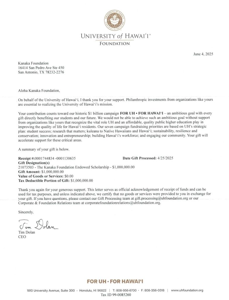 Kanaka is providing cash support to Hawai’s Community Foundation to provide scholarship and other support to Native Hawaiians.